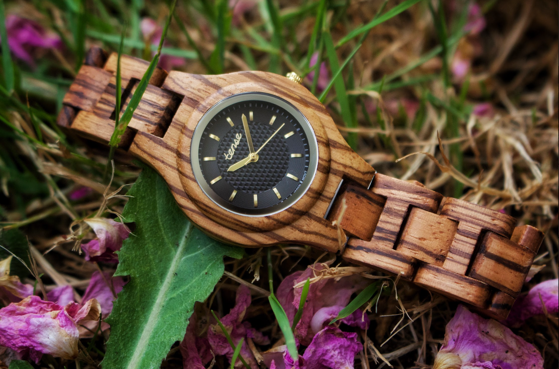 This women's watch shows hour, minute, second markers on a round face. The Small Pacific is made from 100% recycled and reclaimed wood, with Miyota watch movement from Japan and is adjustable in size with stainless steel crown and clasp.