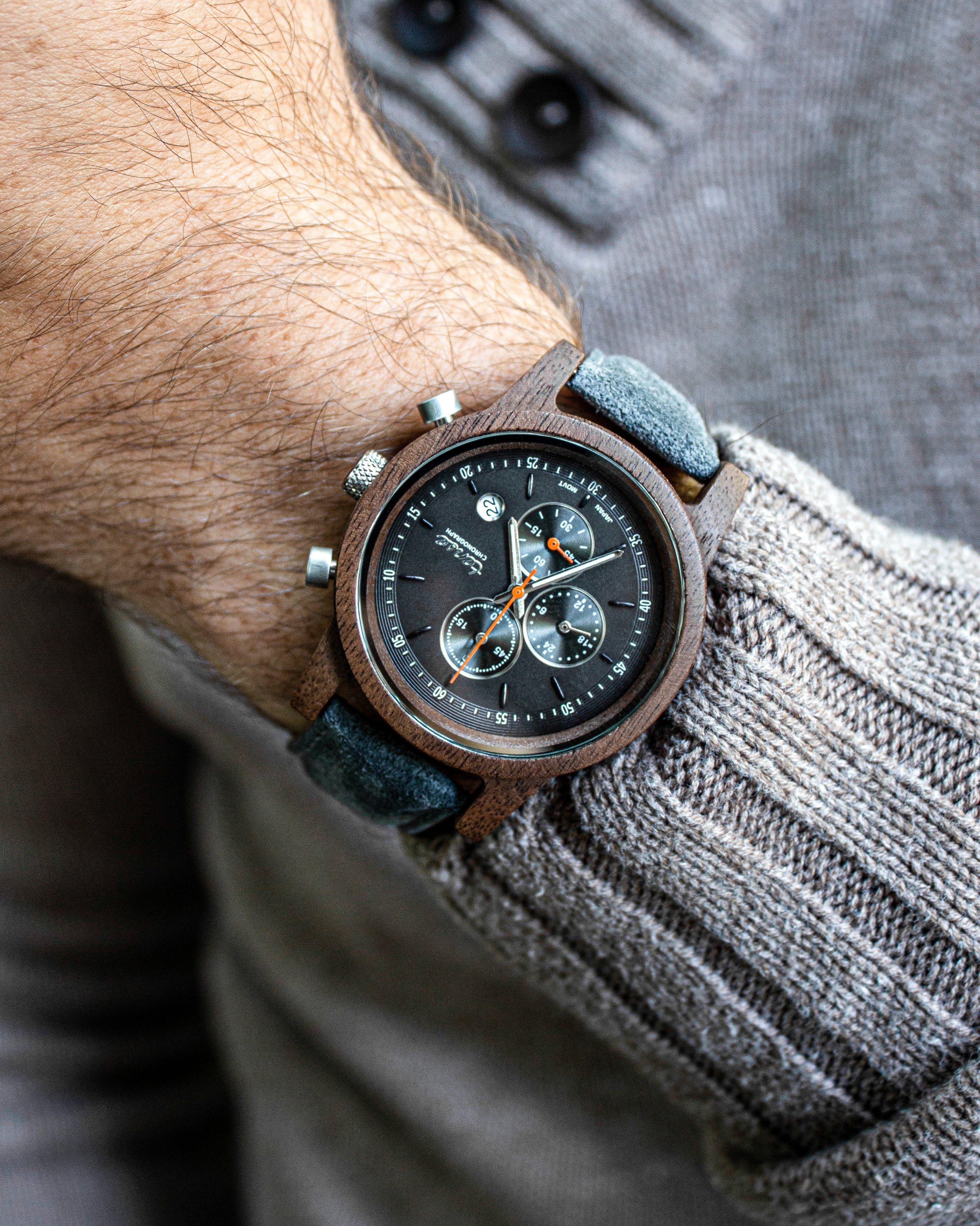 The Cambridge Chrono Suede features Genuine Suede straps. These Straps add a fashion forward twist to this classic watch. This unisex 6-hand chronograph features 3 sub-dials showing the Chrono in minutes, hours and seconds. The Cambridge is made from 100% recycled or reclaimed wood, with Miyota 0S60 watch movement from Japan and is adjustable in size. The Cambridge Chronograph Suede features a limited edition Suede strap to one of our most popular watches. With this Miyota movement, the centre Chrono second hand moves only when the Chronograph function is activated.
