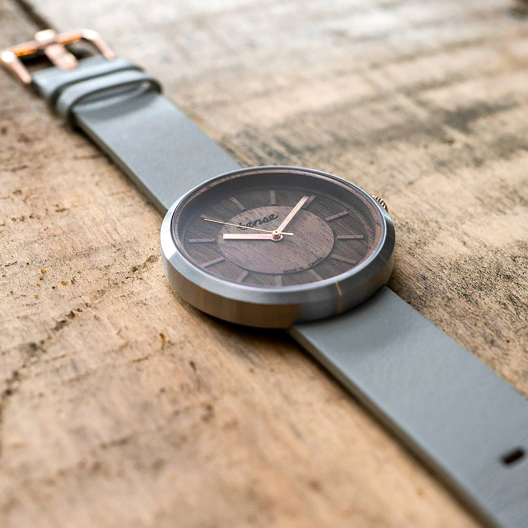 The Cypress Watch has a wood dial and metal case on a leather strap, combining multiple natural materials as part of the new Tense Hybrid Watch Series. This watch is unisex. It contains Swiss-made Ronda 763 Movements protected by scratch-resistant Sapphire Crystal and corrosion resistant Surgical Grade 316 Stainless Steel finished with PVD coating. It has a waterproof rating of 5 ATM. The strap is made of vegan-friendly leather.