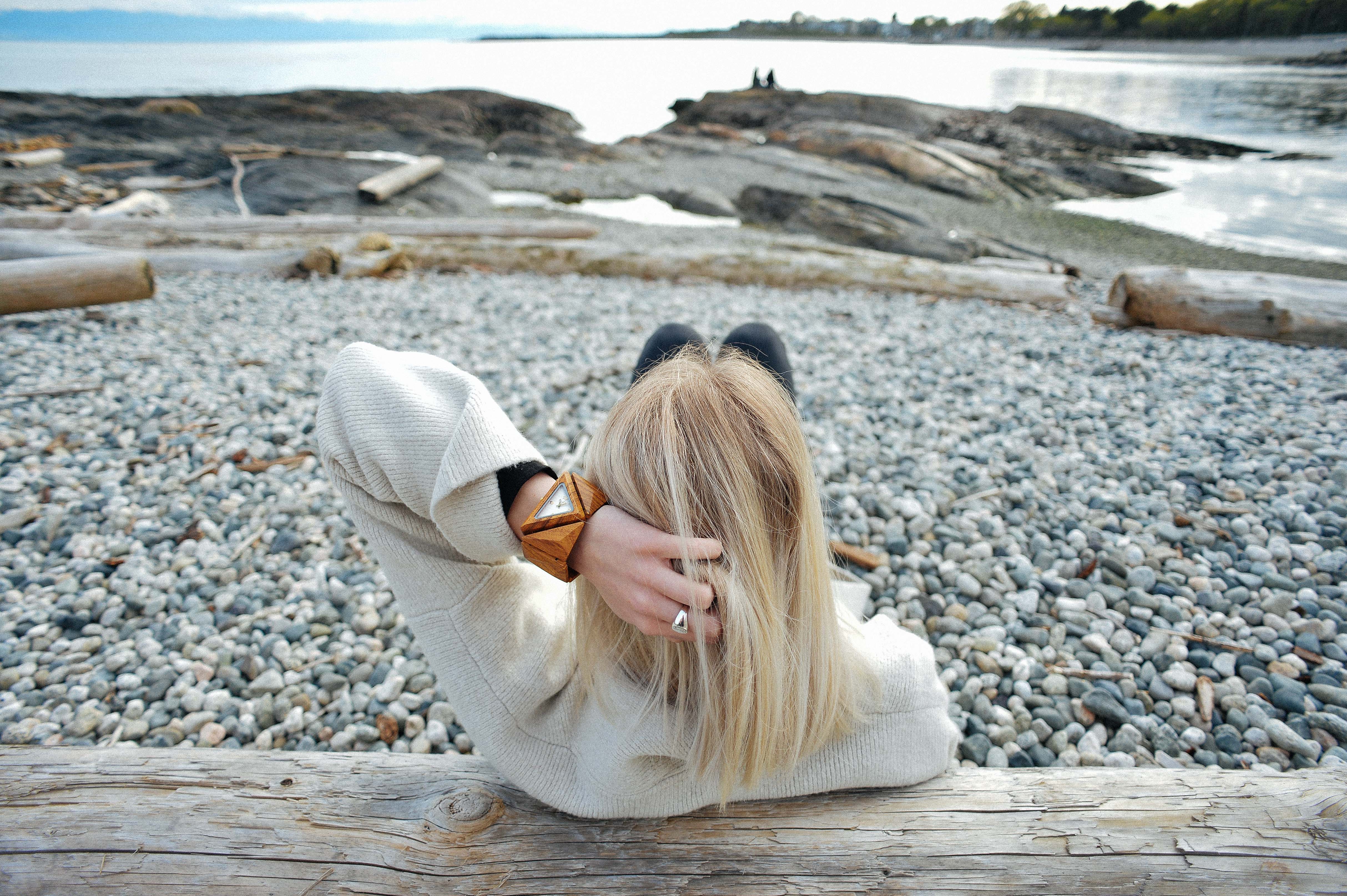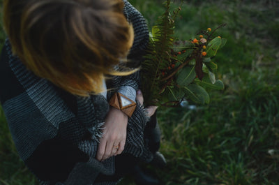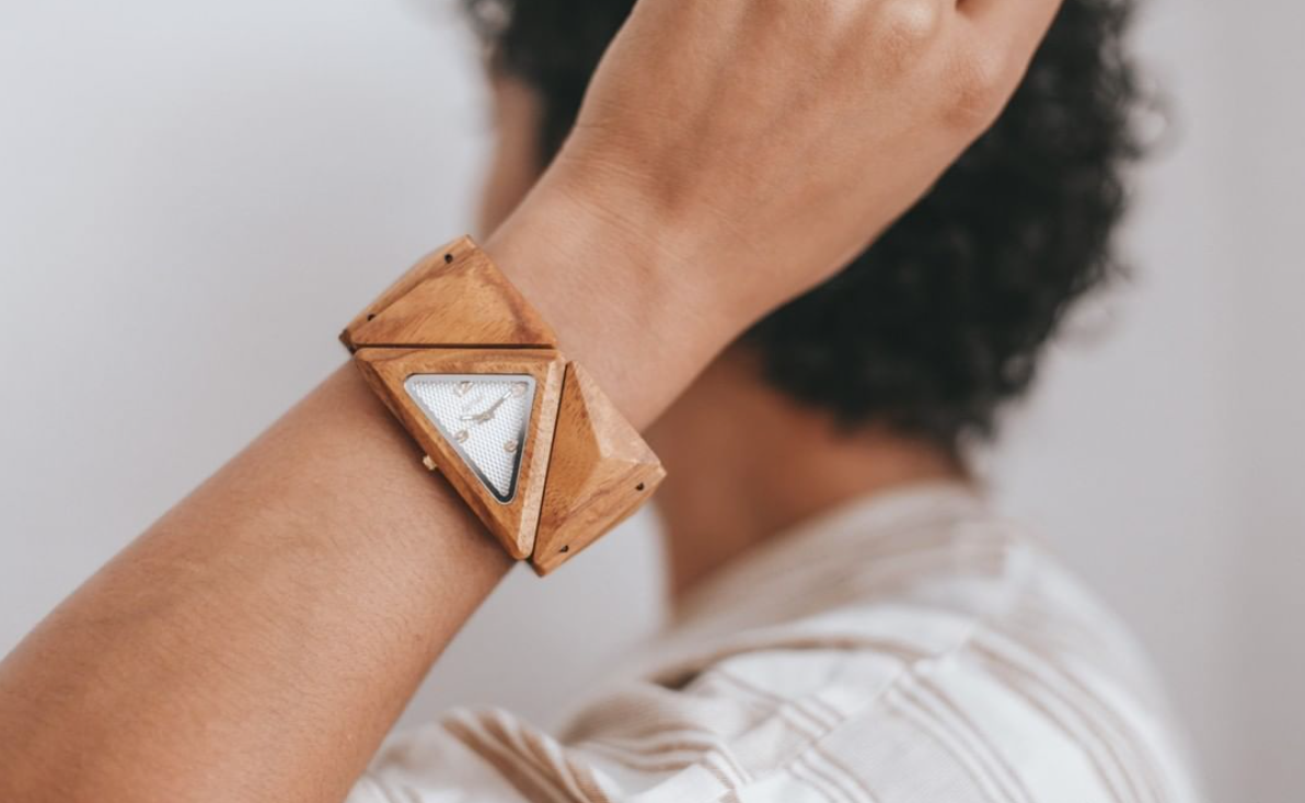 This women's watch shows hourly markers on a triangular face. It has an elastic band with pyramid-shaped pieces of wood forming a bracelet. One size fits all. The Delta is made from 100% recycled and reclaimed wood, with Miyota watch movement from Japan.