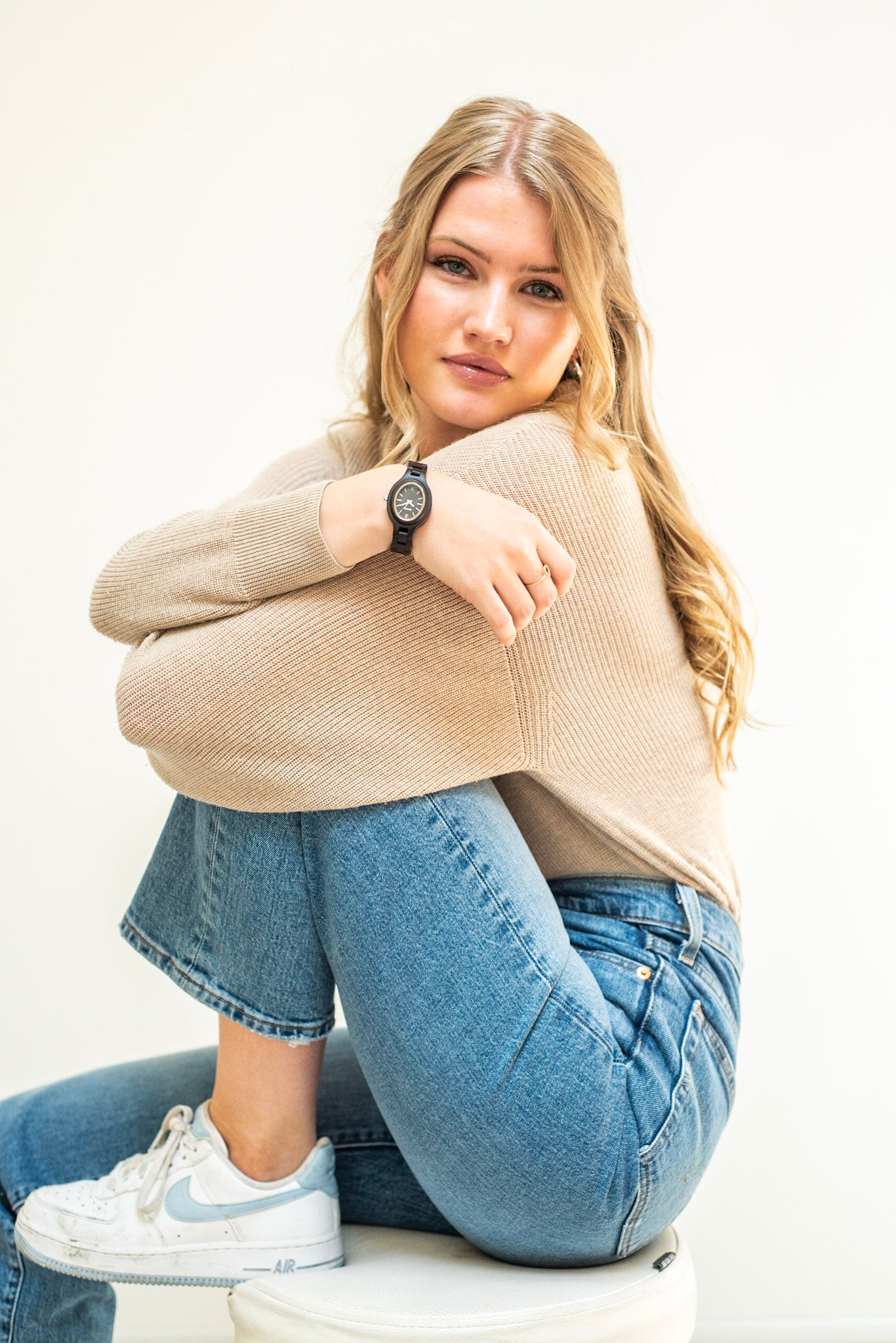 This women's watch shows hourly markers on a oval dial. The Mayne is apart of our Mini Collection. This watch is made from 100% recycled and reclaimed wood, with Miyota watch movement from Japan and is adjustable in size with stainless steel crown and clasp. All Tense Watches are Proudly Made In Canada.