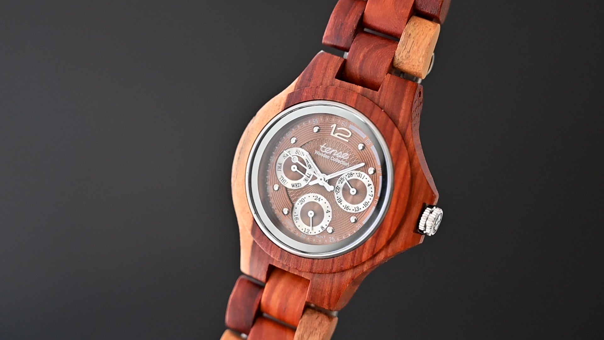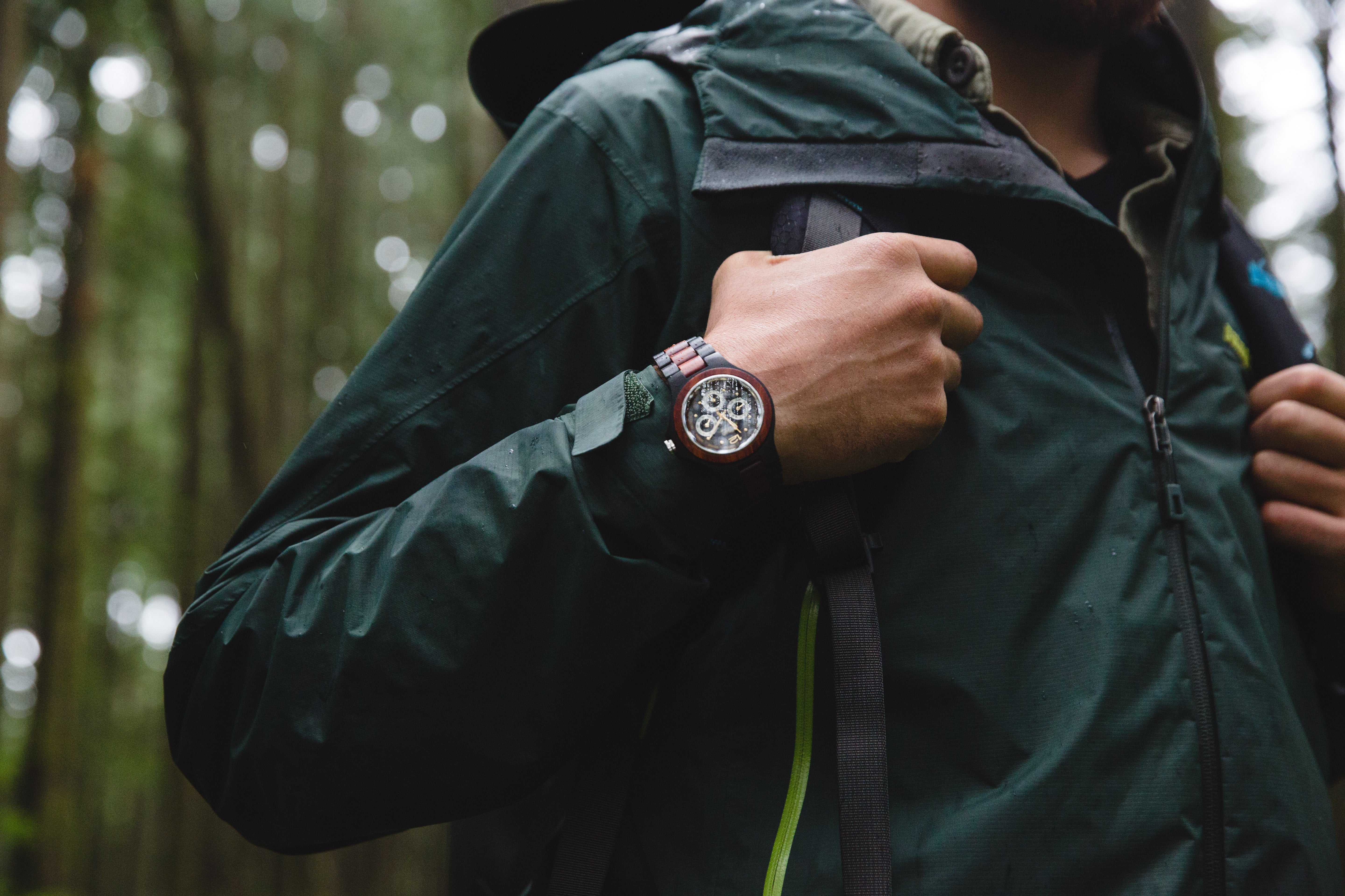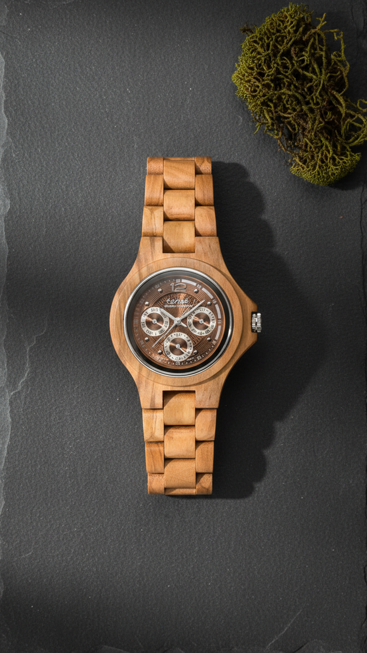 This unisex watch shows hourly markers, calendar date, days of the week, 24-hour display on a round face. The Northwest Multi-function Watch is made from 100% recycled and reclaimed wood, with Miyota watch movement from Japan and is adjustable in size with stainless steel crown and clasp.