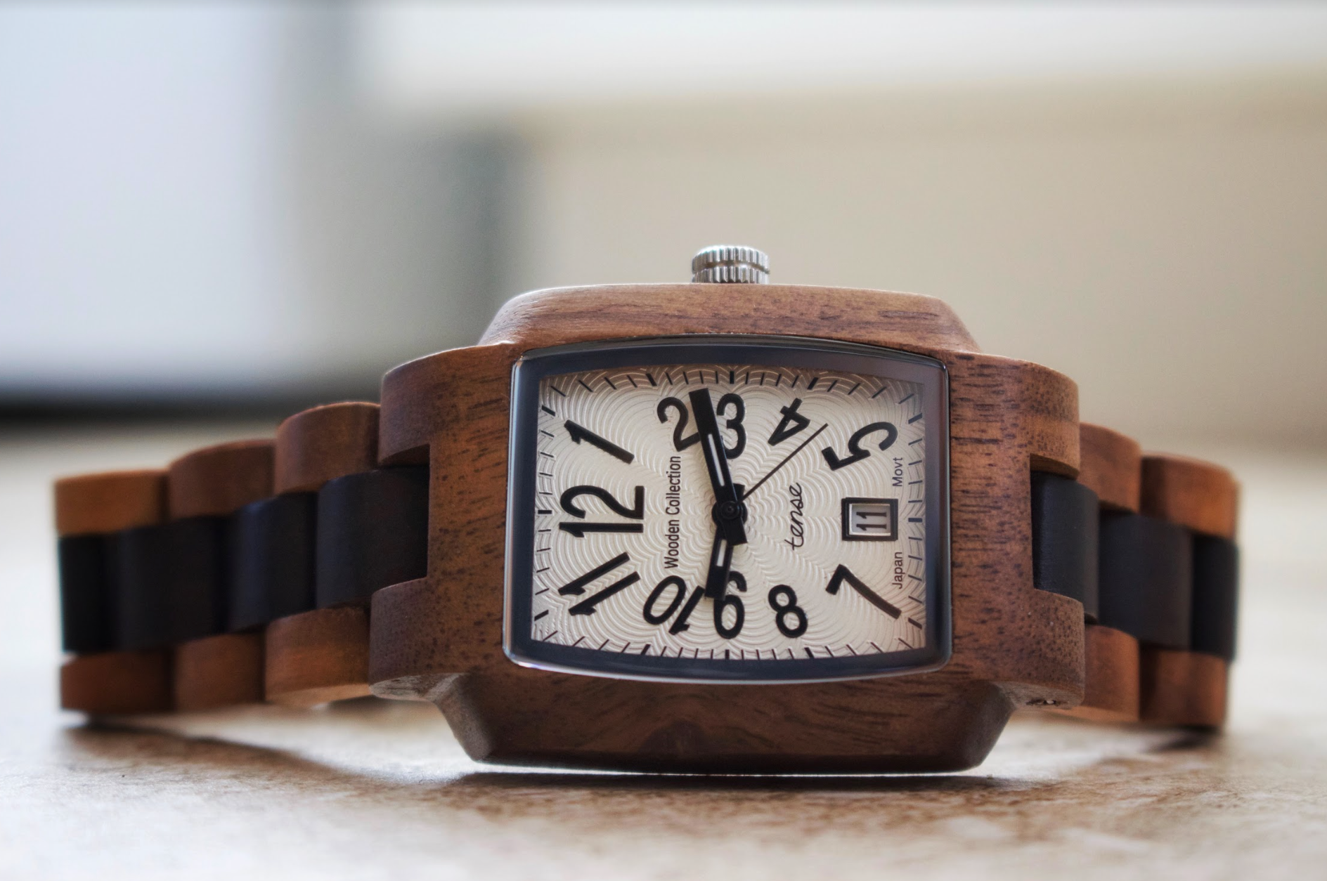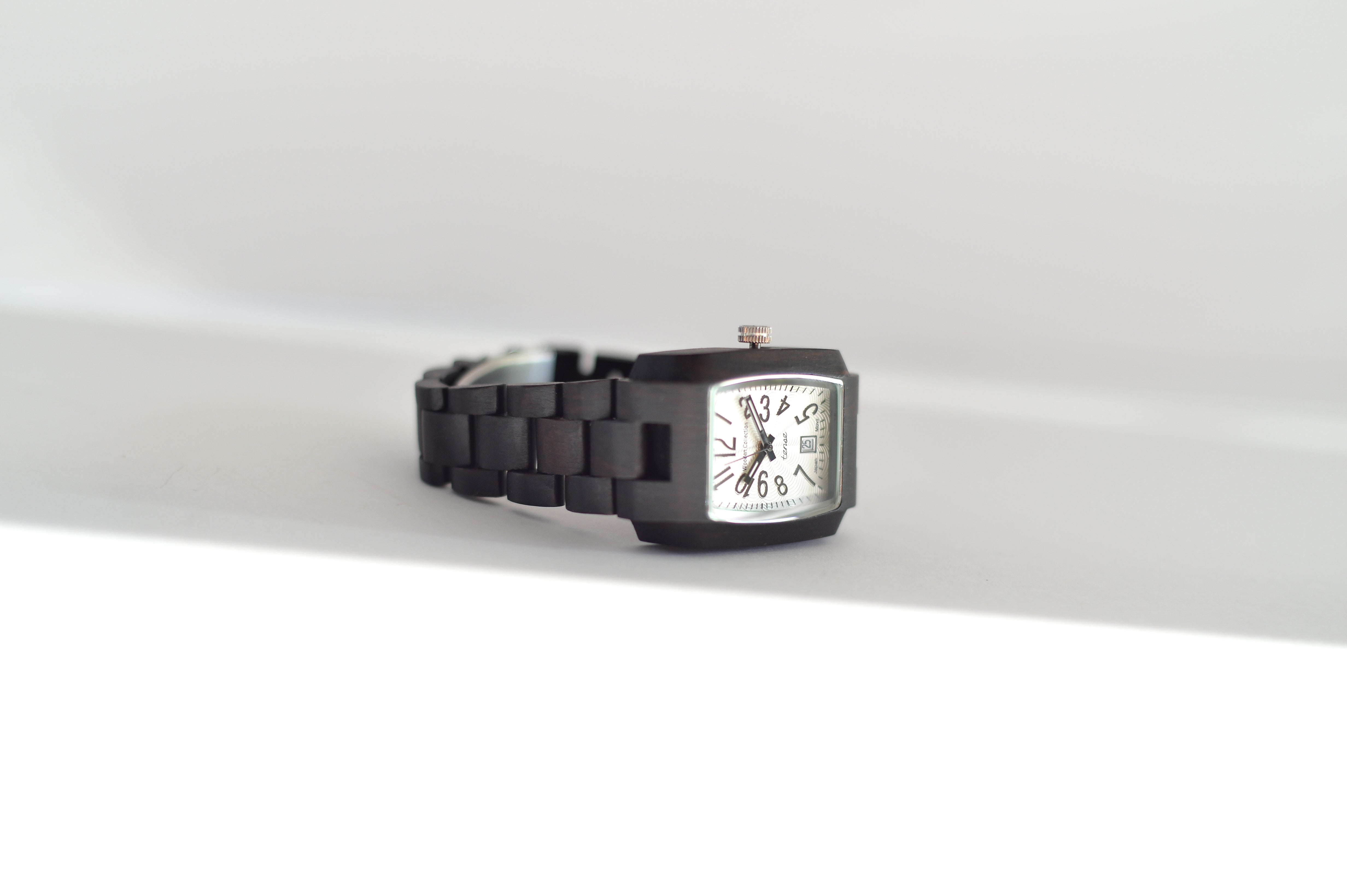 This men's watch shows hour, minute, second markers and the calendar date on a rectangular face. The Timber is made from 100% recycled and reclaimed wood, with Miyota watch movement from Japan and is adjustable in size with stainless steel crown and clasp.